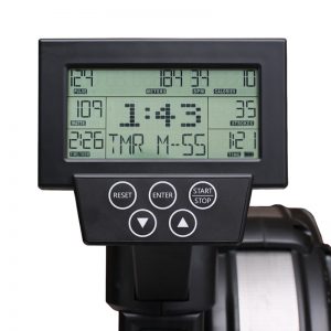You can also toggle between 8 other performance measurements to display in large text/graphics in the middle window: average 500m pace, average meters per stroke, max heart rate, calories per hour, force curve, max watt, watt chart, average watt.
